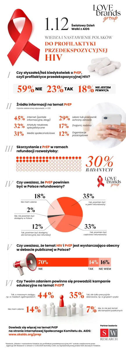 Z tej okazji agencja LoveBrands Group zleciła SW Research przeprowadzenie badania „Wiedza i nastawienie Polaków do diagnostyki przedekspozycyjnej HIV”. Wynika z niego, że niemal co dziesiąty Polak znalazł się kiedykolwiek w sytuacji potencjalnego zakażenia tym wirusem. Jednak prawie 39% z nich nie zdecydowało się na badanie diagnostyczne po takim doświadczeniu. Tylko 20% deklaruje wykonanie odpowiedniego testu.