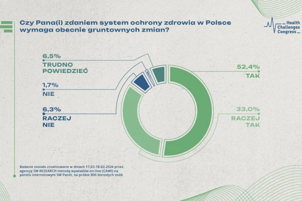 W efekcie wielu Polaków zauważa potrzebę gruntownych zmian w ochronie zdrowia. Ponad połowa (52,4%) z nas jednoznacznie popiera ten pomysł, a 33,0% — „raczej tak”. Przeciwnego zdania jest tylko 8,0% badanych, z czego 1,7% odpowiedziało zdecydowane „nie”. Jedynie 6,5% nie ma zdania w tej kwestii.
