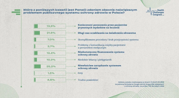 Z czego wynika ten negatywny stosunek do systemu ochrony zdrowia? Jako jego główne problemy badani wskazują niewłaściwe zarządzanie (25,2%) oraz długi czas oczekiwania na świadczenia zdrowotne (21,6%), w związku z czym wielu odczuwa konieczność ponoszenia prywatnych wydatków na leczenie (13,5%). 12,4% respondentów uważa, że system jest niedostatecznie finansowany, a co dziesiąty (10,4%) zauważa niedobór lekarzy i pielęgniarek.
