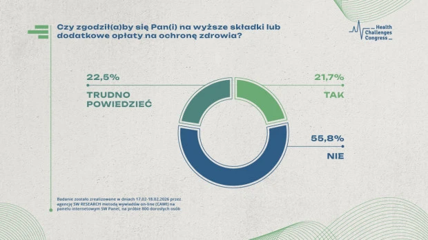 Skoro tak wielu Polaków popiera zmiany w publicznym systemie ochrony zdrowia, to ilu z nich gotowych jest płacić wyższą składkę w celu jego dofinansowania? Okazuje się, ze znacznie mniej. Zgodę na taką podwyżkę wyraziło tylko 21,7% badanych. Ponad połowa (55,8%) z nich sprzeciwia się takiemu pomysłowi. 22,5% odpowiedziała „trudno powiedzieć”.