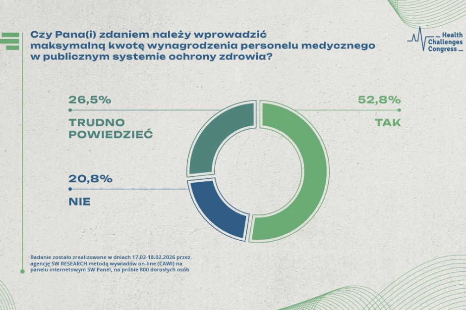 Jednym z najszerzej omawianych w kontekście publicznej ochrony zdrowia tematów są pensje lekarzy. Dlatego zapytaliśmy też ankietowanych o to, czy uważają, że należy ustalić górną granicę wynagrodzenia personelu medycznego zatrudnionego w ramach NFZ. Okazuje się, że nieco ponad połowa (52,8%) z nich popiera takie rozwiązanie; przeciwny temu jest co piąty (20,8%) badany. 26,5% nie ustosunkowało się do tej kwestii. Widać więc, że poparcie społeczne dla takiego pomysłu jest dosyć wysokie.