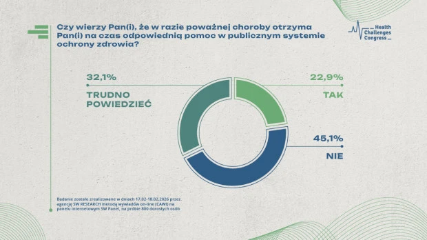 Szeroko pojęta opinia publiczna od dawna zwraca uwagę na potrzebę generalnej reformy systemu opieki zdrowotnej w naszym kraju. Coraz więcej Polaków mu nie ufa — prawie połowa (45,1%) badanych nie wierzy w to, że w razie poważnej choroby otrzyma odpowiednią pomoc na czas. Tylko 22,9% jest tego pewnych; blisko jedna trzecia (32,1%) ankietowanych nie ma zdania w tej kwestii.