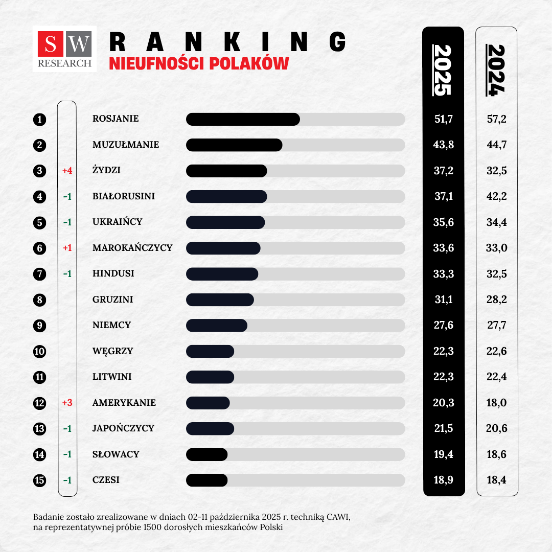 Podium zamykają Żydzi ze współczynnikiem 37,2 (w 2024 r. 32,5), którzy w ciągu roku „awansowali” aż o cztery pozycje. Z pewnością duży wpływ na to miała sytuacja w Strefie Gazy i jej nagłośnienie w mediach.